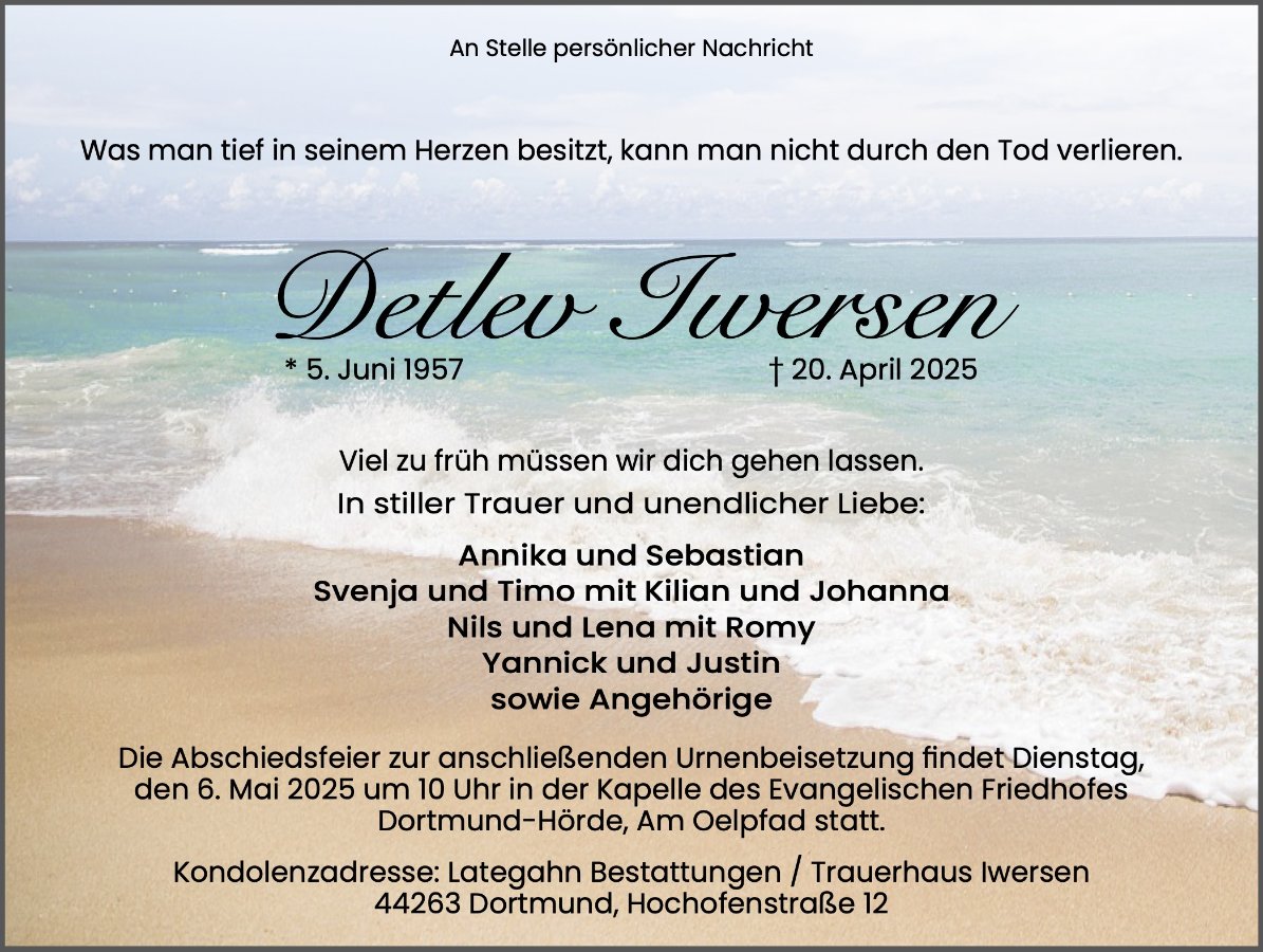 Niemals geht man so ganz......Liebe Annika, Svenja, Nils und Yannick, es ist einfach unfassbar, dass euer Papa nicht mehr da ist. Es macht auch mich sehr traurig.In euren Herzen wird er aber immer bei euch sein.Deshalb wünsche ich euch von ganzem Herzen, dass euer Schmerz möglichst bald der liebevollen Erinnerung weicht. Eure Gaby