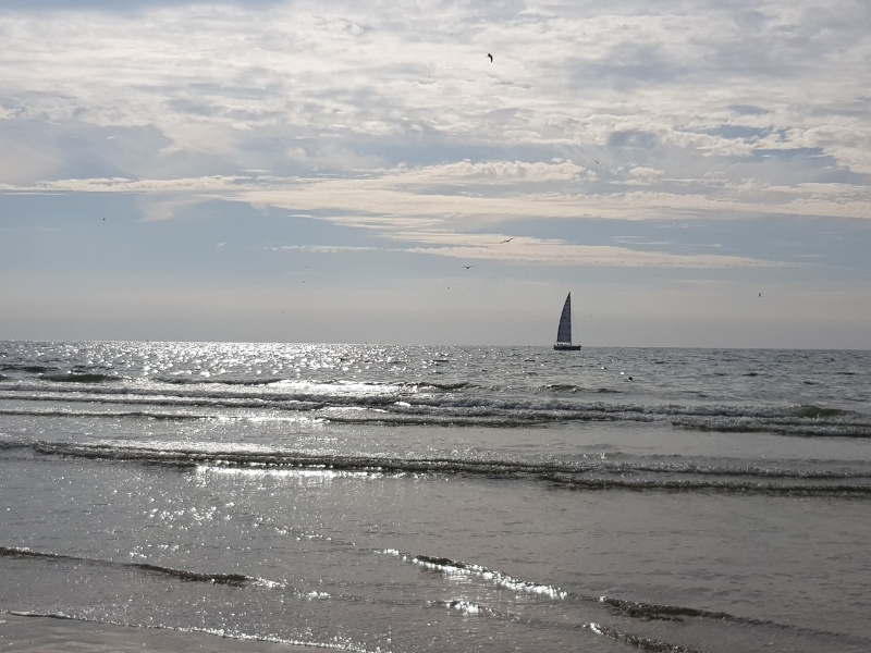 Ein Schiff segelt hinaus und ich beobachte, wie es am Horizont verschwindet.